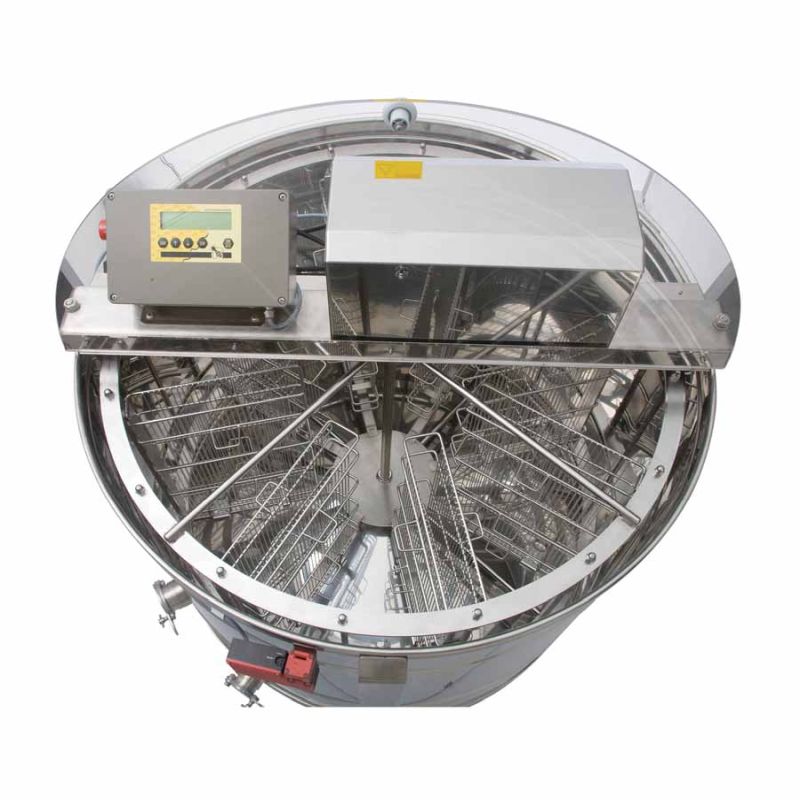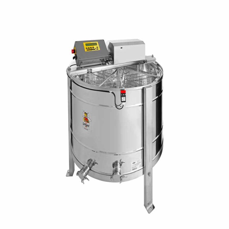 L'extracteur automatique 8 rayons de Logar (entièrement électronique) est équipé d'un moteur de 250 W (230 V), d'une commande entièrement automatique et d'un dispositif de sécurité intégré qui coupe automatiquement le moteur à l'ouverture du couvercle. L'extracteur dispose de deux robinets de vidange en inox 6/4'' (Ø 42 mm) ; l'un est soudé au point le plus bas afin que tout le miel puisse s'écouler de la cuve. Toutes les pièces en contact avec le miel sont en matériaux agréés pour l'usage alimentaire. Le couvercle est en acrylique transparent.